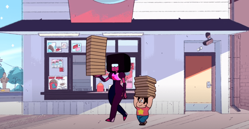 With their twenty pizzas in hand, Garnet resolves to do the opposite of what you’d normally do with pizza (eat it)…which is apparently giving it away. I mean, there’s not exactly a precise opposite of “eating pizza”, so I’m sure if she were in other company, there’d be some dispute on her interpretation, but Steven finds it perfectly logical randomness.