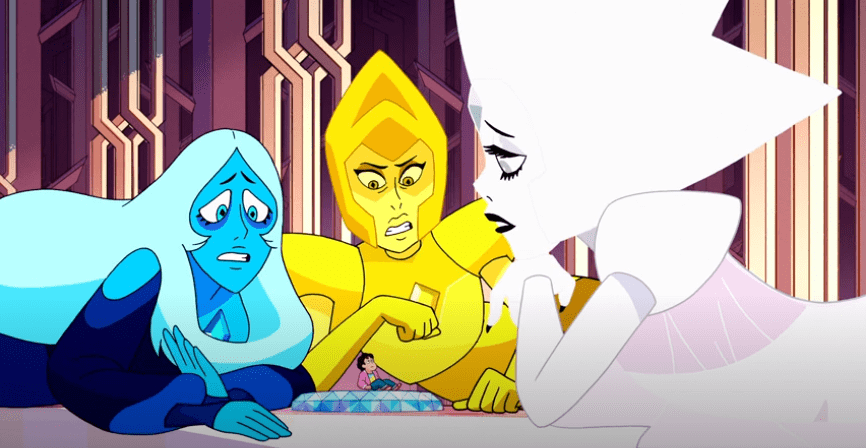 And for an even easier resolution, the Diamonds just happen to drop by looking for some replacement for Pink Diamond that they can shower their affection on, and Spinel is looking for someone she can befriend that she hasn’t brutally attacked recently!