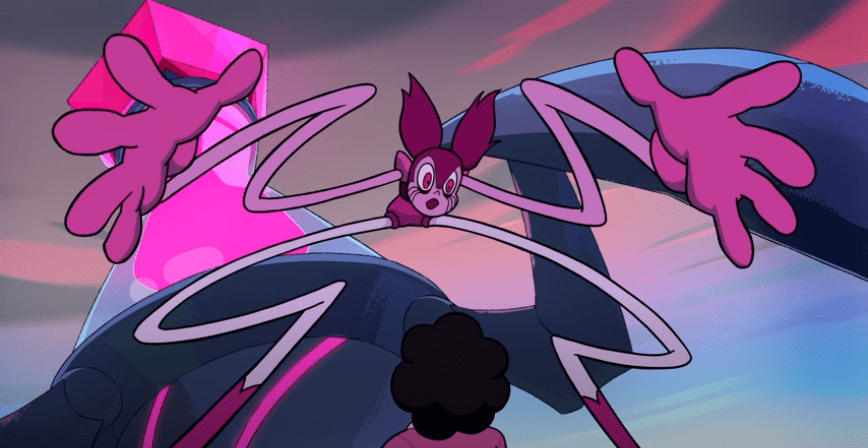 Unfortunately, this doesn’t actually tell Steven much about her. Pearl recognizes her from somewhere (presumably yet another Gem from Pink Diamond’s past), but before they can actually talk, Spinel manages to poof all the others and hits Steven with the same ominous pink weapon before he gets a hold of it and poofs her.