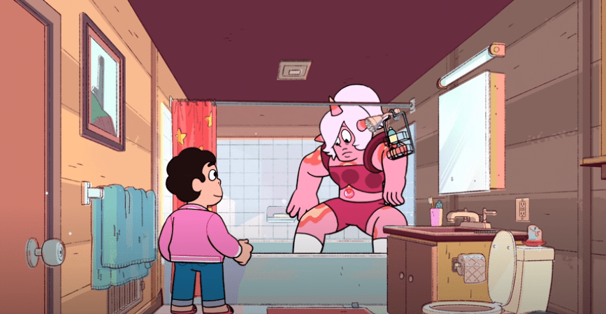 Steven: That used to be a loaded question, but now I can say with confidence that I’m Steven Universe! And you’re in my bathroom.