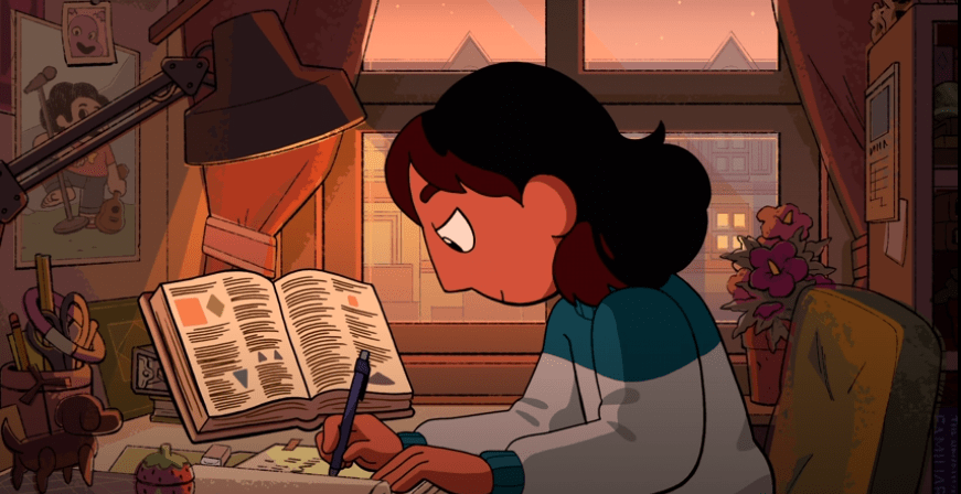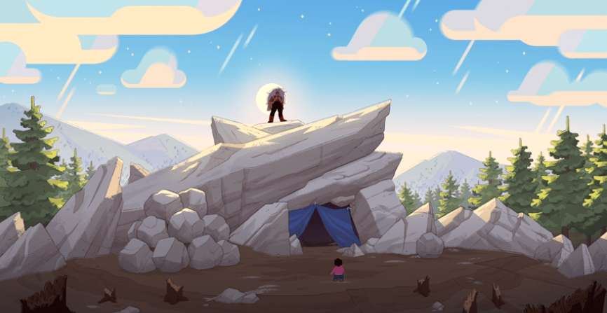 Steven: Life is a little different these days. The Diamonds have ended their reign of terror, the intergalactic war is over, and Earth is officially an independent planet. We’re all safe to explore our dreams. Lars opened up his own pastry shop, and it’s got a real cute space gimmick going on. Sadie’s been touring with the Suspects, promoting their new album, and Connie’s been getting a head start on college prep. She’s two years away from applying, but she says it doesn’t hurt to start early.
