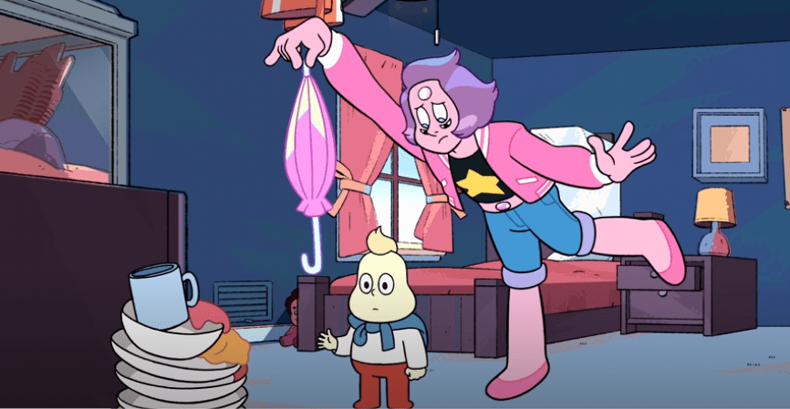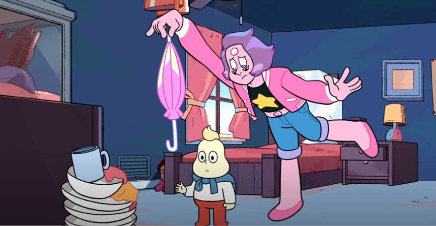The Mary Poppins is strong with this one. But sadly, not strong enough for Onion. And unfortunately, Steven conveniently forgot about a commitment he made to run a safety “geminar” as Sunstone, and for some reason Garnet is lost without him. So he leaves Pearl to the tender mercies of Onion.