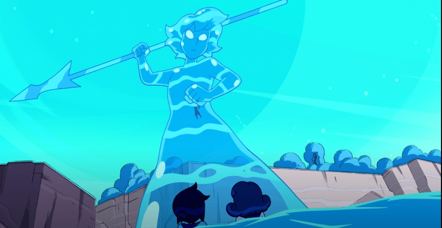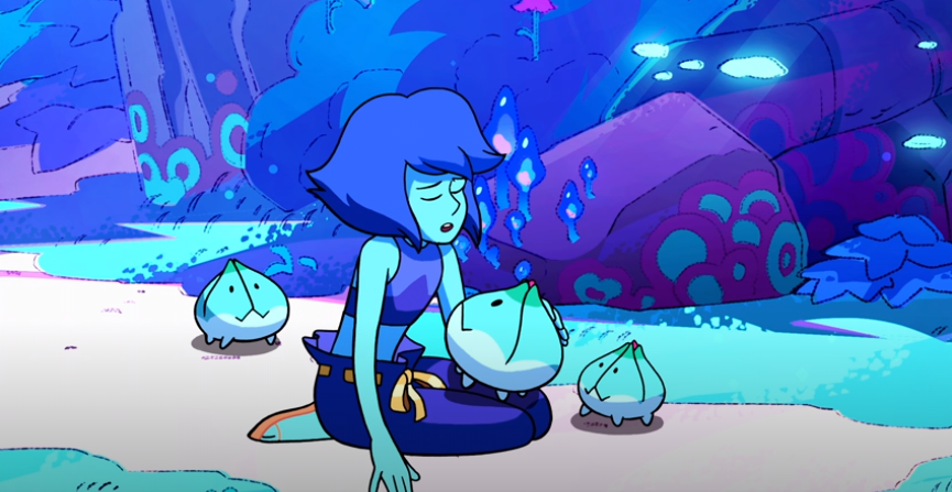 Steven sits out the fight (technically he could join in by floating, but Lapis is determined to do it by herself and Steven’s busy protecting the cute critters), but Lapis initially has an advantage from all the tricks she’s learned despite being outnumbered…at least until they start copying those tricks.