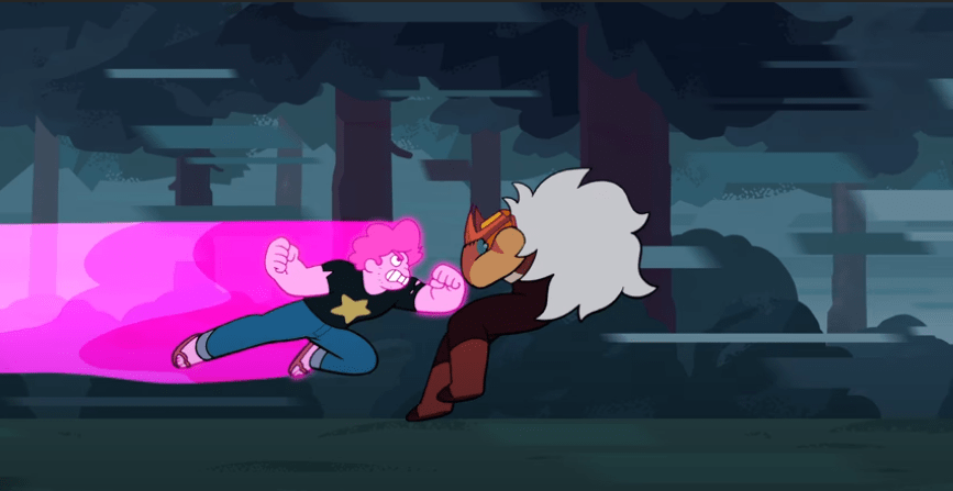 One montage and three whole days later, Steven’s shifted to a constant battle-readiness (as indicated by the pink glow) and a look more akin to the buff character of “Stefan”. So he finally challenges Jasper to that rematch they’ve been building up to.