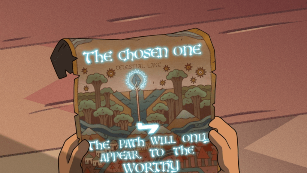 When she goes home to pack for her epic quest, Eda and King both laugh at her for believing the wizard, but as soon as she finds this “secret writing” on the map (she just had to hold it up under sunlight – what kind of lame trick is THAT for a map that’s supposed to lead to a powerful magical artifact?).
