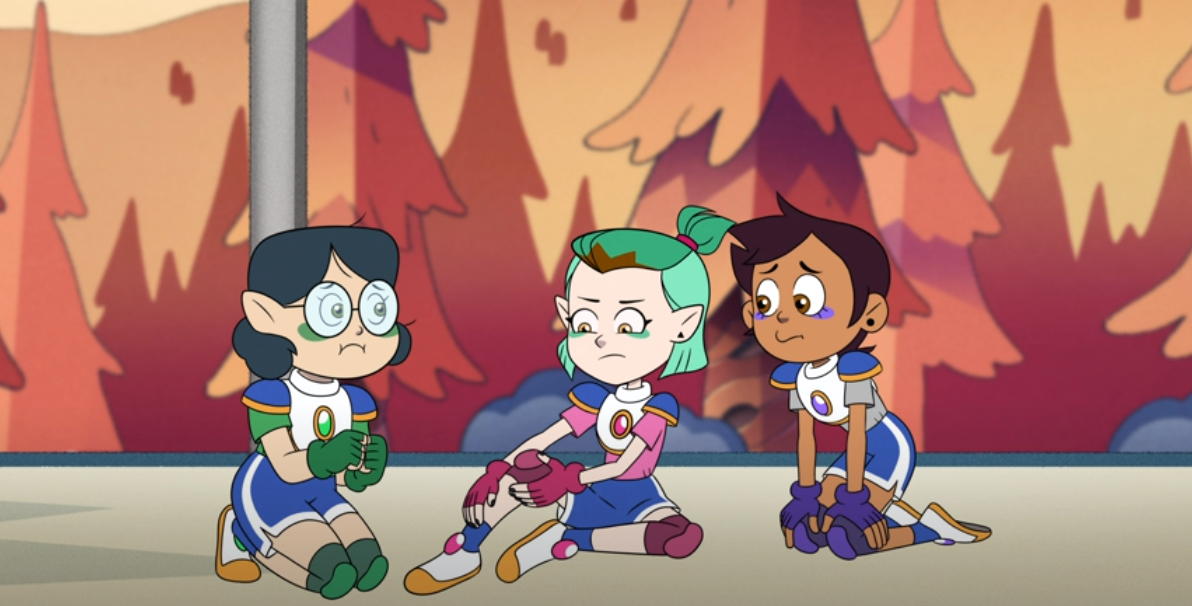 Amity manages to rally the troops, but as Gus is still slightly traumatized by the Grudgby field, Amity herself takes his place as the third player (evidently it was just training with Luz that she found so unbearable…).