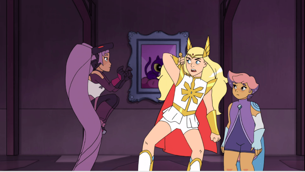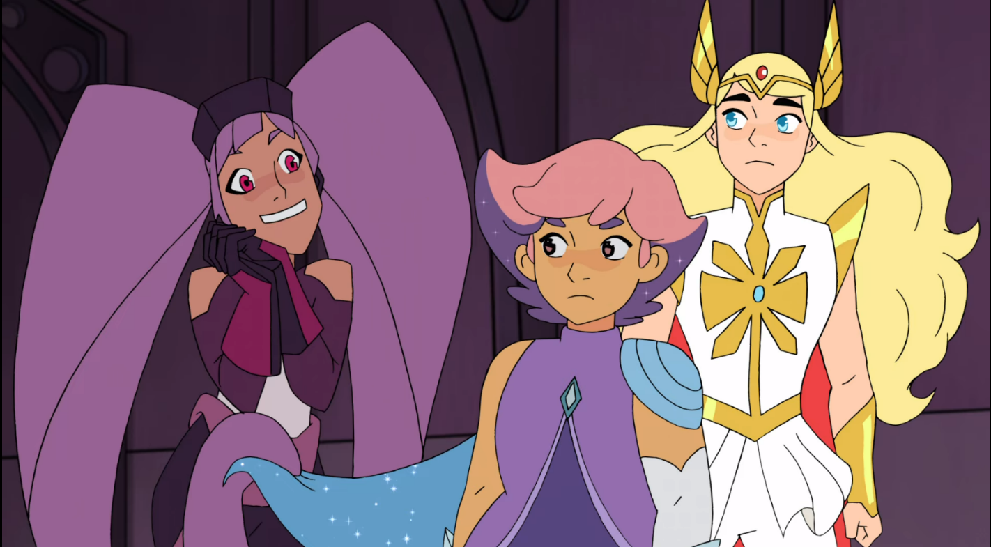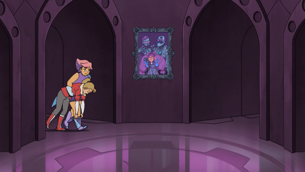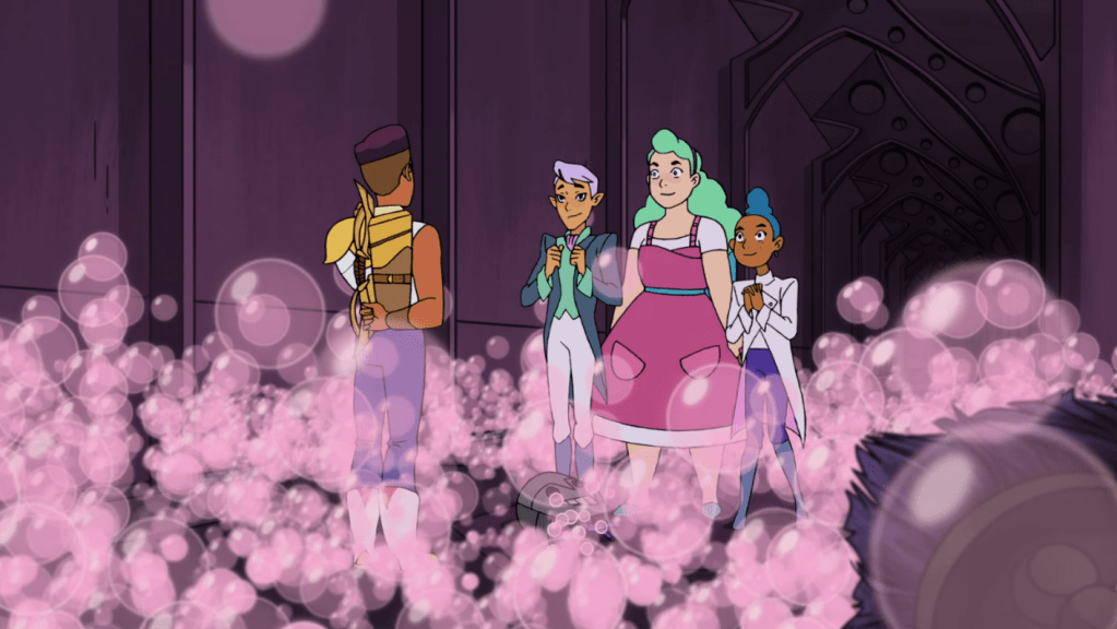 This episode is mainly about Entrapta, Princess of Dryl, and she’s an interesting character for two main reasons. First, she was an evil scientist in the Horde in the original series (and not a princess, although evidently she always had the prehensile hair). Second, she’s canonically autistic in this show (it’s never explicitly stated in the dialogue, though), created with the input of an autistic crew member. While I have some issues with her characterization, it’s always nice to have confirmed neurodivergent representation in a fairly mainstream show.