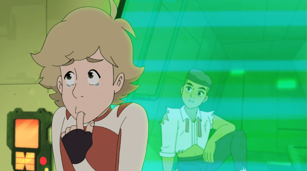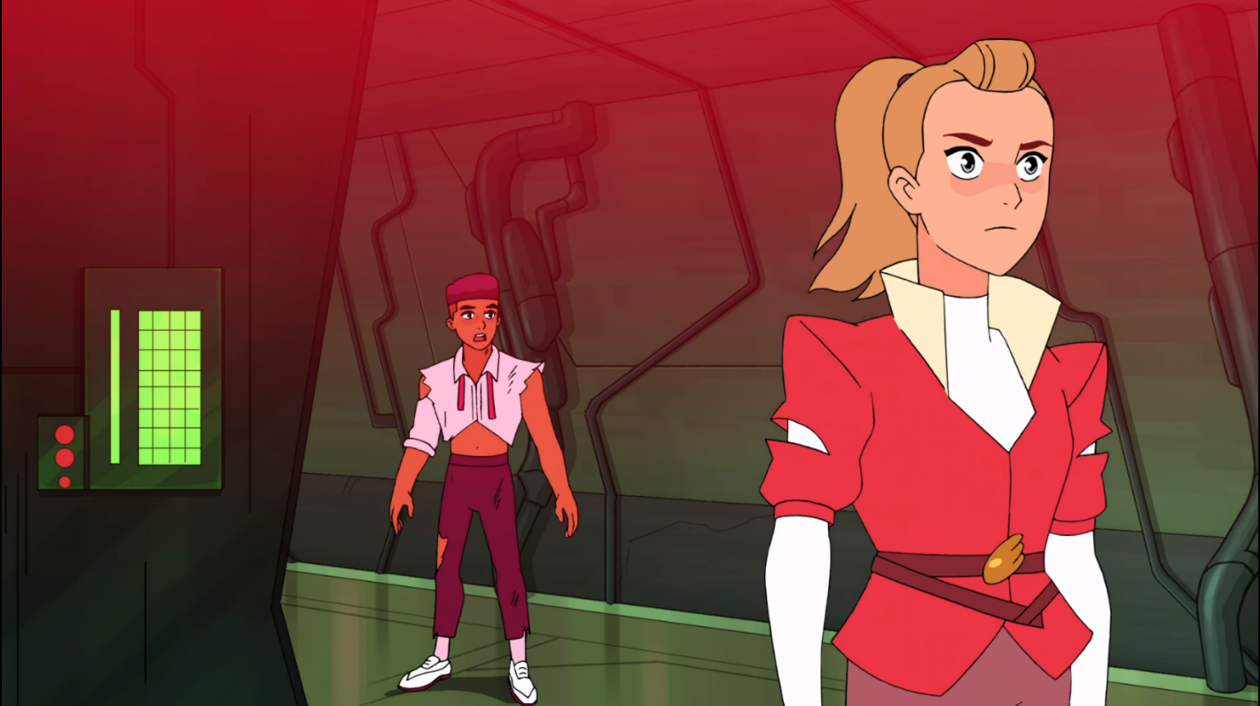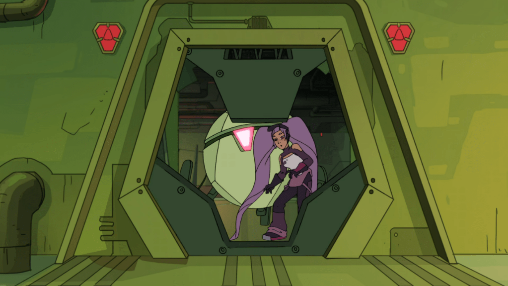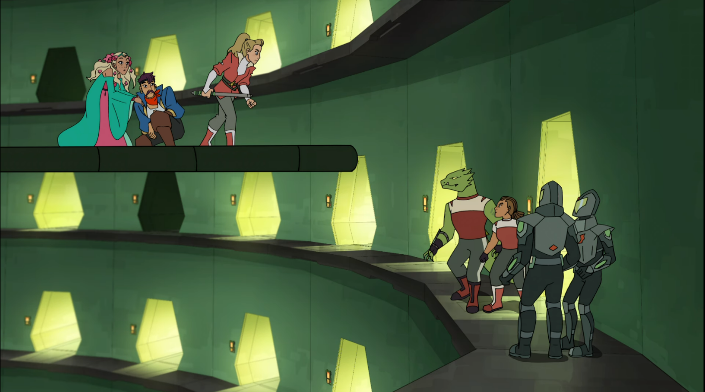 Adora orders them into a (emergency?) passage where they can steal a skiff, but for some reason there are extra security precautions in this passage. It’s never properly explained why rooms have to be sealed and purged as they go, it’s just there for dramatic convenience.