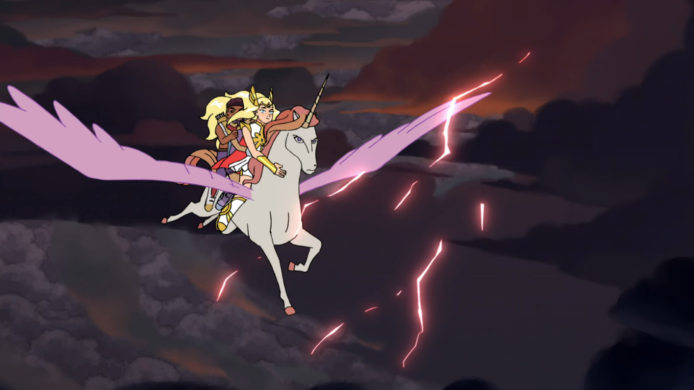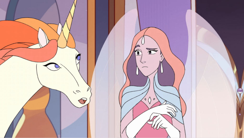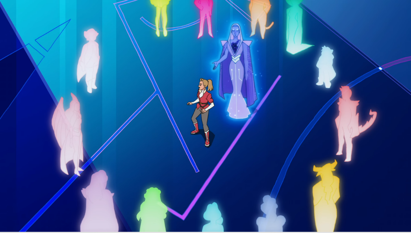 This shot shows a couple princesses that we never seem to meet (it’s possible the teal one is supposed to be Peekablue, which we do sort of meet in the last season, but that’s it). There also seems to be a cat-person princess, which might be alluding to the Magicats from the original series, or maybe just as a relic of a discarded backstory for Catra or something. There also seems to be a mistake, as Angella and Glimmer both draw power from the same runestone, so it should probably be one or the other and not both, but then again, it’s never explained what makes a “princess” except to have a corresponding runestone, so who knows?