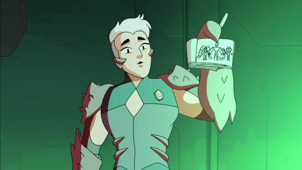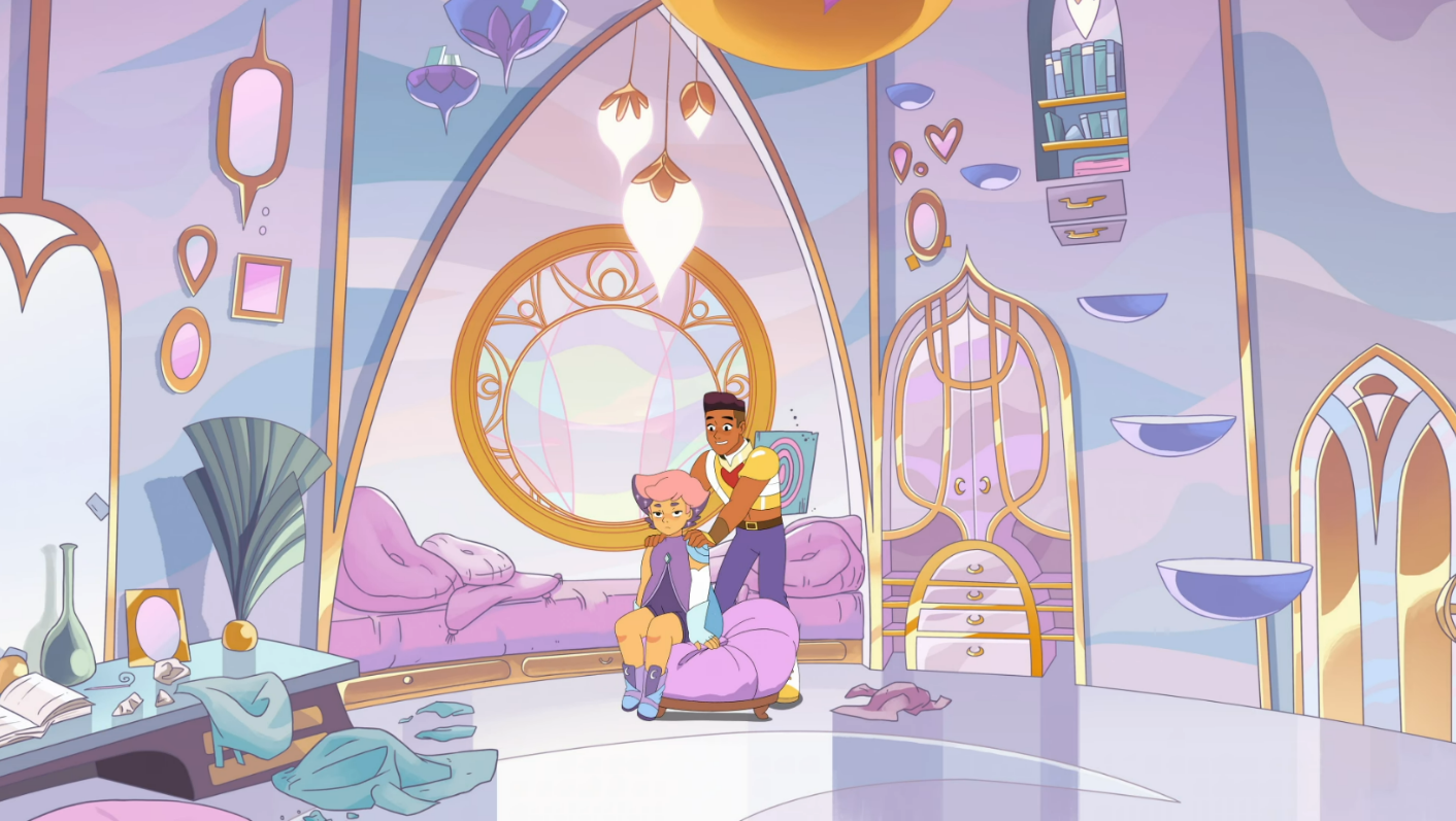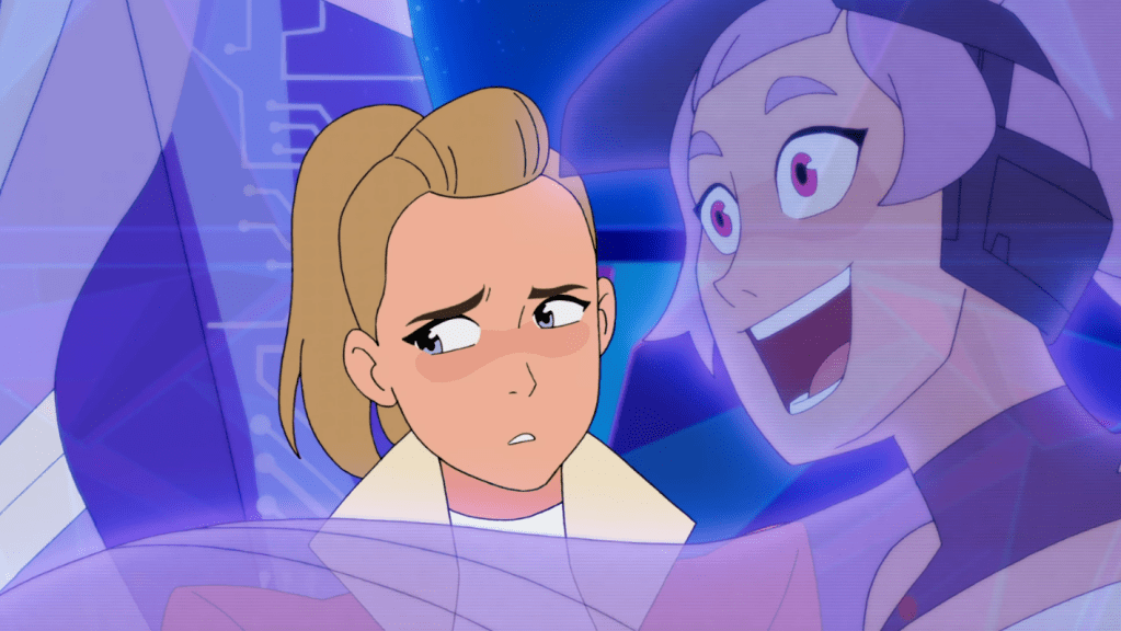 Meanwhile at Bright Moon, Glimmer seems to be doing better now that she’s opened up to her mom (only really glitching when she’s stressed or instinctively tries to teleport). But Adora’s been gone long enough that she’s worried about her, and naturally she also feels guilty because Adora only left to help her.