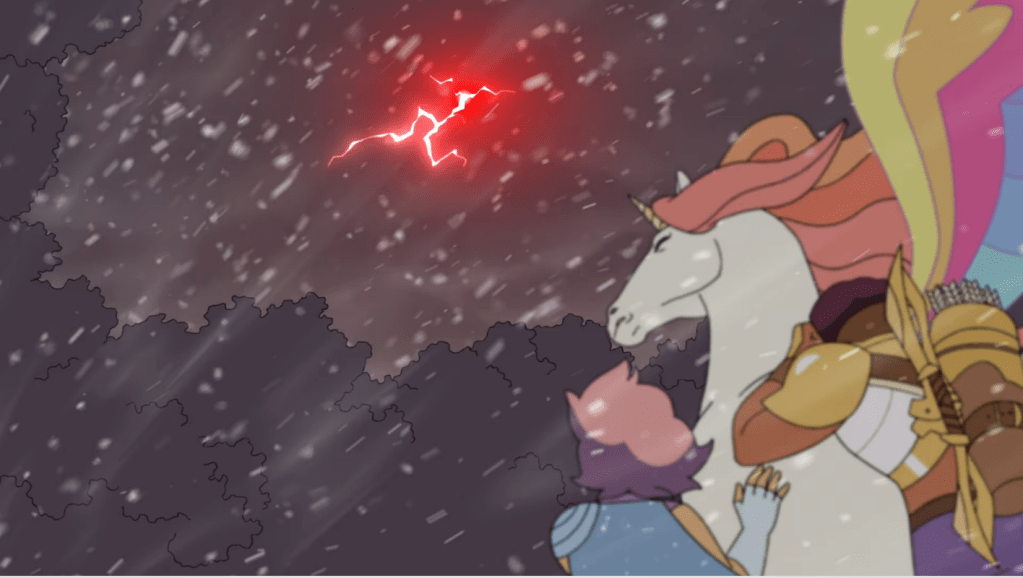 Elsewhere, Bow, Glimmer, and Swift Wind are approaching the Beacon. They seem to be going by Narnia rules for Talking Horses, as no matter how much of a hurry they’re in, nobody rides Swift Wind except in an emergency.