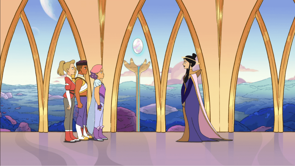 The party planner thing is evidently a reference to the original series…and Glimmer’s conspicuous lack of teleportation should ring some alarm bells, but of course everyone’s too focused on the coronation to actually pay attention to Glimmer.