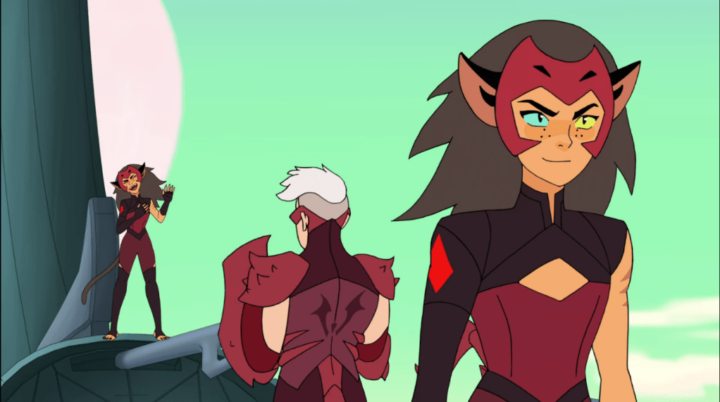 But anyway, Adora transforms and tag-teams with Bow to clear out the guards. Then of course Catra shows up!