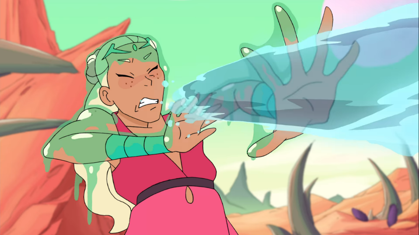 In the ensuing scrap, Adora asks Perfuma to use a cactus to block off pursuit, resulting in nothing but Perfuma getting cactus spines all over her, so they have to run and hide somewhere else.