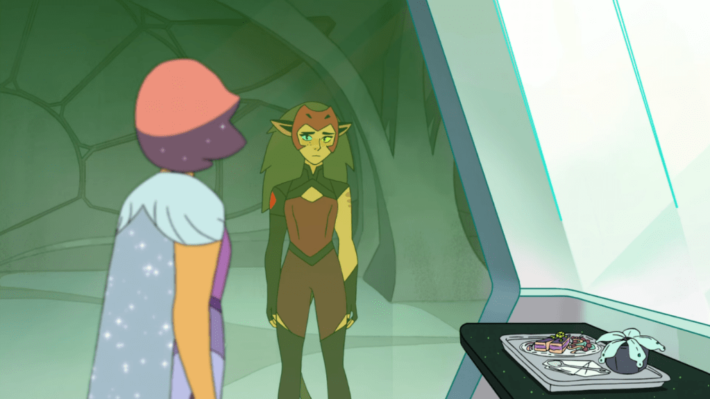 The isolation is clearly taking a toll on both of them, but it might be worse for Catra, since there are technically people around, but those people are kind of all the same, and are all watching her to ensure she behaves. She wasn’t even trying to talk to Glimmer – maybe she just wanted to hear any voice besides Prime’s (all the clones, including Hordak, are actually voiced by the same person).
