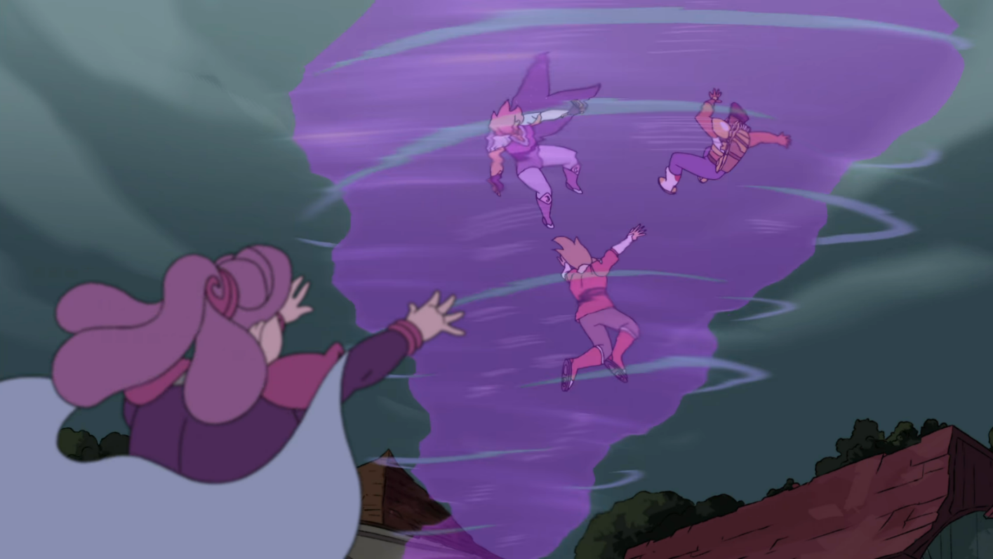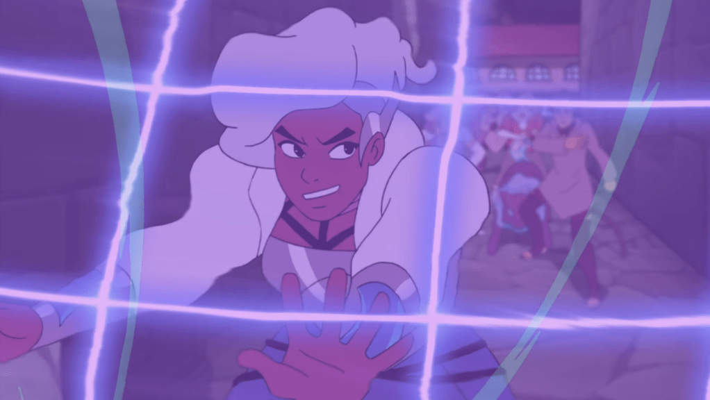 Glimmer manages to teleport them out of the whirlwind and into the alley where Catra’s posse’s been lurking.