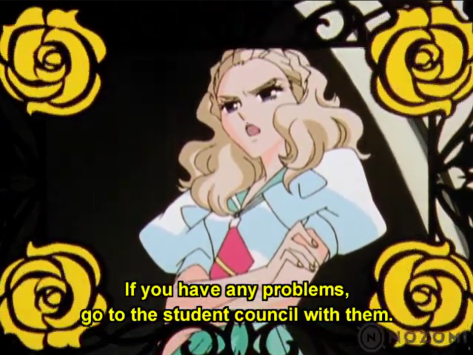 Anyhow, there’s another student council meeting. They establish that, after losing to Utena, Saionji’s confined himself to his room (and hasn’t been to class).