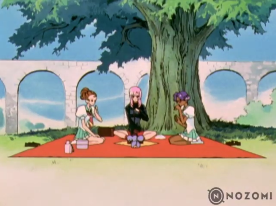 Anyhow, the episode begins with Utena, Anthy, and Wakaba all having a little picnic together.